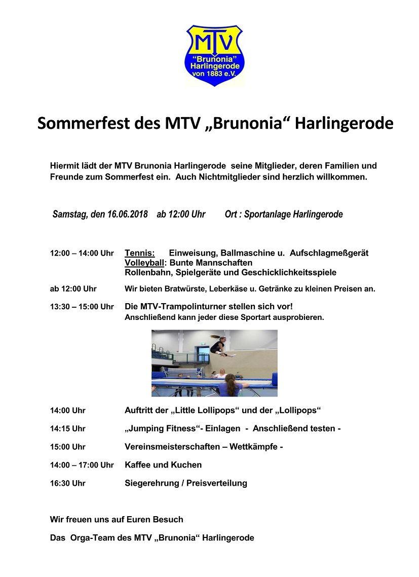 am 16.6.2018 ab 12:00 Uhr veranstaltet der MTV sein diesjähriges Sommerfest. Es wird wieder ein schönes Programm mit vielen Aktivitäten und Darbietungen geben. Jede Abteilung oder Sparte sollte vertreten sein und sich präsentieren. Erstmalig wollen wir auch Spartenwettkämpfe veranstalten, d.h. es wird quasi ein Vereinsmeister in den Klassen "Kinder, Jugendliche und Erwachsene" ermittelt. Hier winken auch Siegerpreise. Die Spartenmannschaften bestehen jeweils aus vier Personen (bei mehr Personen wird das der Ergebnis auf vier umgerechnet). Die vier bis fünf Disziplinen sind von allgemeiner, sportlicher Art; so dass niemand einen entscheidenden Vorteil hat. Der Spaß steht im Vordergrund!