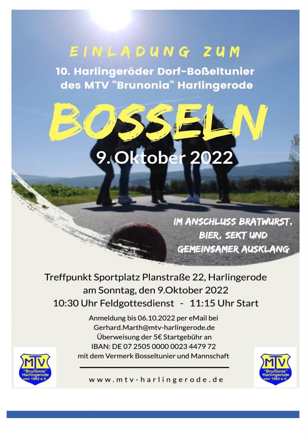 Die 10. Harlingeröder Boßel-Dorfmeisterschaft findet am 09.10.2022 in der Feldmark Harlingerode statt. Start und Ziel ist wieder der Sportplatz Planstraße. Diese Jubiläumsveranstaltung beginnt um 10:30 Uhr mit einem Feldgottesdienst und um 11:15 Uhr starten die ersten Teams. Weitere Einzelheiten sind bitte aus den beigefügten Anlagen zu entnehmen.