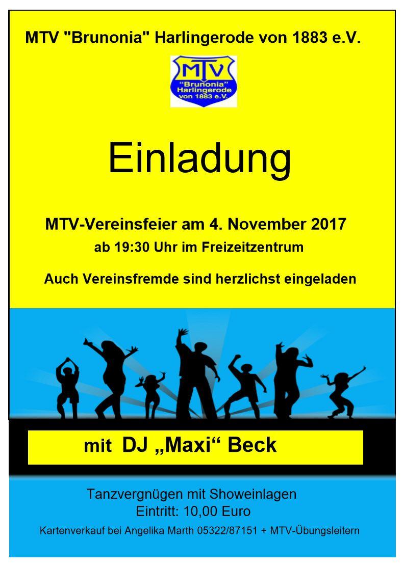 am 4. November 2017 ab 19:30 Uhr im Freizeitzentrum Harlingerode - Tanzvergnügen mit Showeinlagen - Auch Vereinsfremde sind herzlichst eingeladen Eintritt: 10,00 Euro Kartenverkauf bei Angelika Marth 05322/87151 + MTV-Übungsleitern