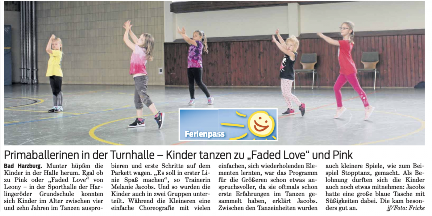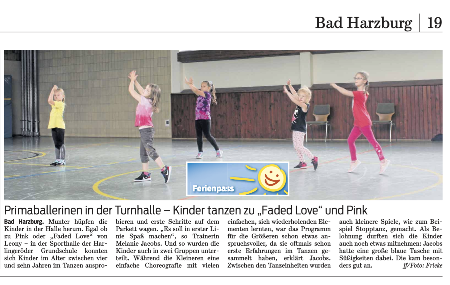 Bad Harzburg. Munter hüpfen die Kinder in der Halle herum. Egal ob zu Pink oder „Faded Love“ von Leony – in der Sporthalle der Harlingeröder Grundschule konnten sich Kinder im Alter zwischen vier und zehn Jahren im Tanzen ausprobieren und erste Schritte auf dem Parkett wagen. „Es soll in erster Linie Spaß machen“, so Trainerin Melanie Jacobs. Und so wurden die Kinder auch in zwei Gruppen unterteilt. Während die Kleineren eine einfache Choreografie mit vielen einfachen, sich wiederholenden Elementen lernten, war das Programm für die Größeren schon etwas anspruchsvoller, da sie oftmals schon erste Erfahrungen im Tanzen gesammelt haben, erklärt Jacobs.