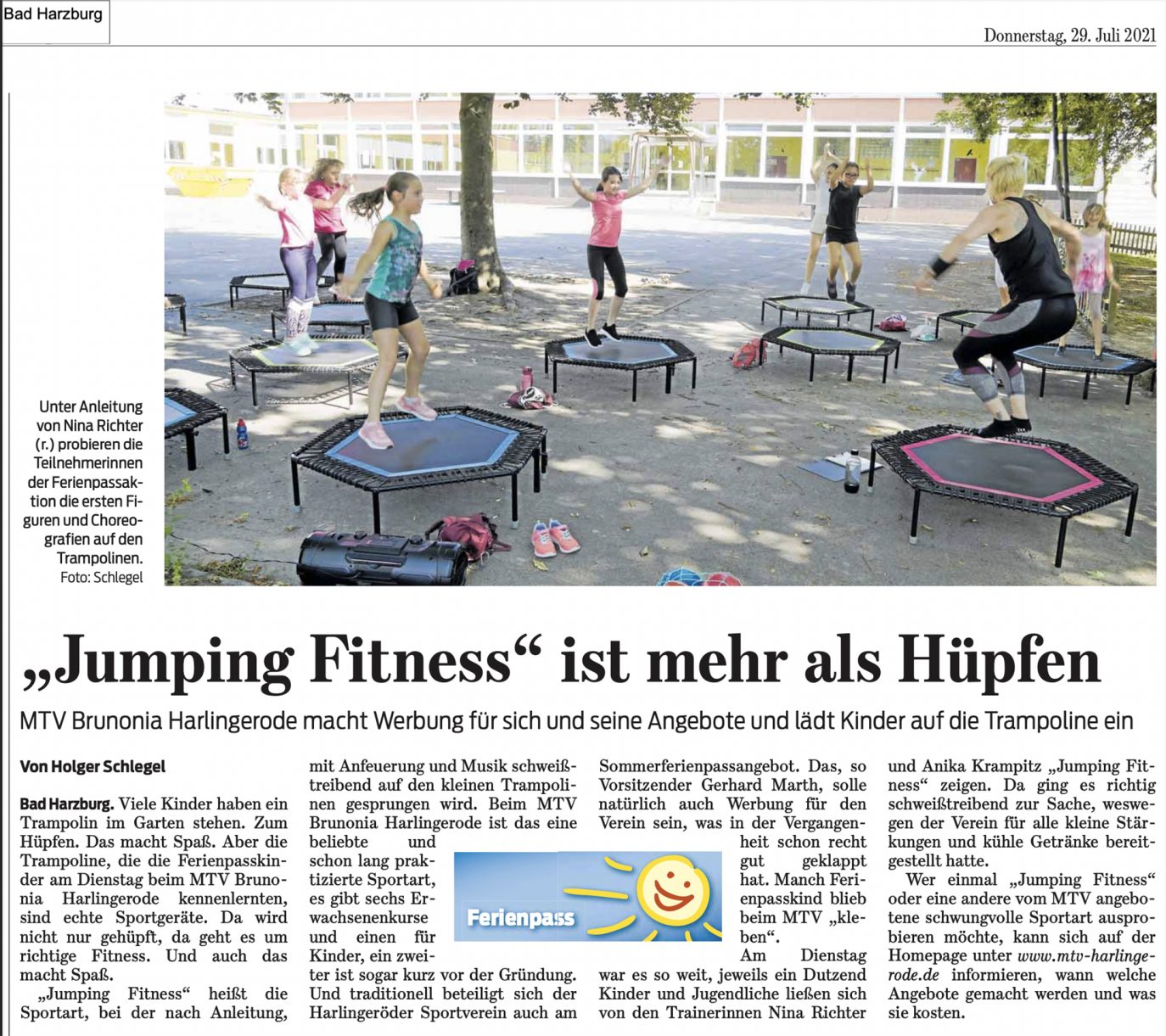 „Jumping Fitness“ heißt die Sportart, bei der nach Anleitung, mit Anfeuerung und Musik schweißtreibend auf den kleinen Trampolinen gesprungen wird. Beim MTV Brunonia Harlingerode ist das eine beliebte und schon lang praktizierte Sportart, es gibt sechs Erwachsenenkurse und einen für Kinder, ein zweiter ist sogar kurz vor der Gründung. Und traditionell beteiligt sich der Harlingeröder Sportverein auch am Sommerferienpassangebot. Das, so Vorsitzender Gerhard Marth, solle natürlich auch Werbung für den Verein sein, was in der Vergangenheit schon recht gut geklappt hat. Manch Ferienpasskind blieb beim MTV „kleben“.